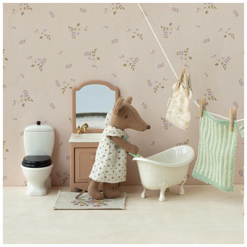 Nezbytný doplněk do koupelny každého myšího domečku. Obsahuje malou skříňku pod umyvadlem a samozřejmě také zrcadlo. Přidejte k tomu toaletu a vanu od Maileg a rozšiřte možnosti hry.