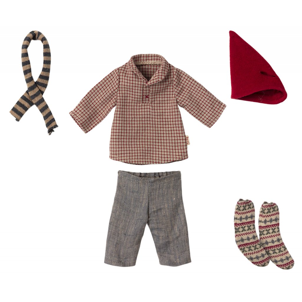Stylový vánoční outfit pro myšáka velikosti Medium v tradičních svátečních barvách. Kombinace kárované košile, elegantních kalhot a červené čepičky zaručí, že bude každý myšák vypadat jako pravý vánoční gentleman. Součástí je také šála a ponožky s drobným zimním vzorem.