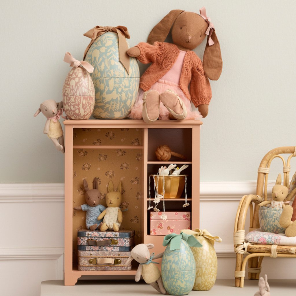 V krásném kovovém vajíčku s jemným potiskem a velkou měkkou mašlí se skrývá malý plyšový králíček v puntíkovaném oblečku. Tento něžný set je ideálním velikonočním dárkem. Králíček má v rukách magnety, takže se může kolem vajíčka chytit a vytvořit tak roztomilou dekoraci i hravý příběh.