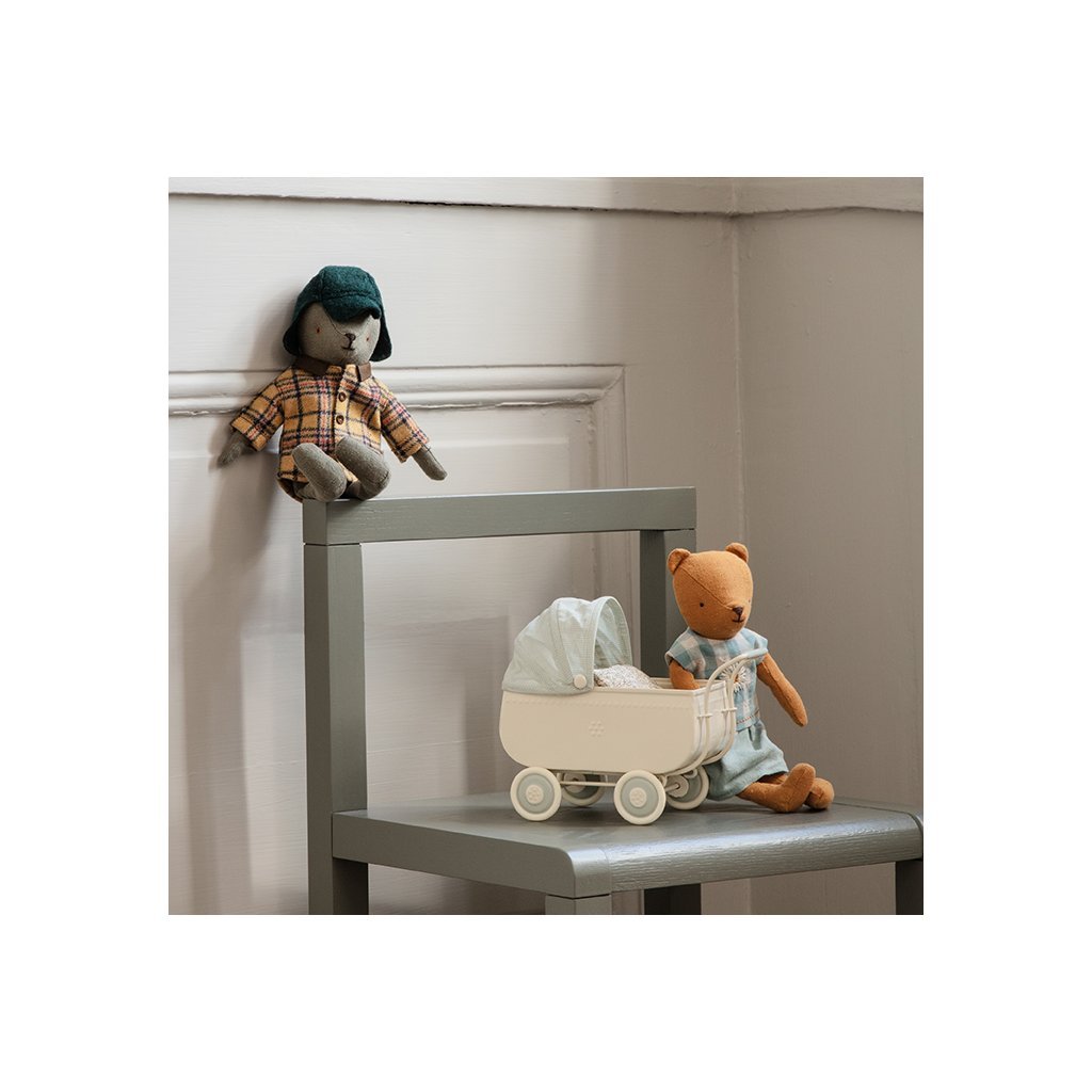 Krásný vintage kočárek pro myšky a zajíčky od dánské značky Maileg je jako vystřižený z pohádkového dětství. Má kovovou konstrukci s jemně zdobenými detaily, látkovou stříšku, kterou lze sklopit, a měkké barevné tóny, které se hodí do každé herničky i dětského pokojíčku. Přenáší atmosféru nostalgie a láskyplného hraní, přesně tak, jak to umí jen Maileg.
