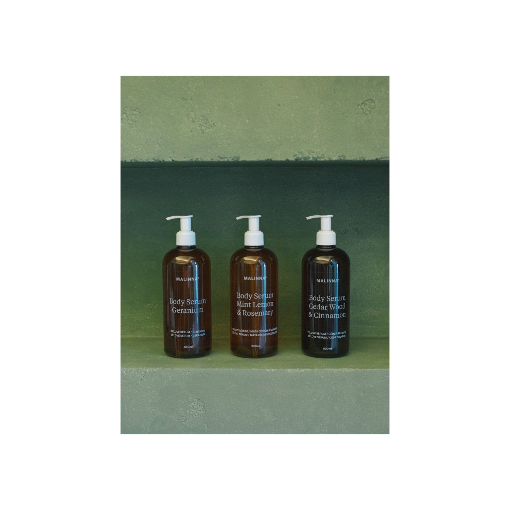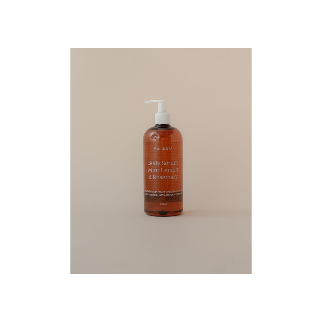 Tělové sérum MALINNA° Máta Citron a Rozmarýn namíchané ze vzácných syrových organických olejů, esenciálních olejů a přírodní mořské soli. Díky unikátnímu zpracování má vysokou vstřebatelnost. Proniká hluboko do pokožky, detoxikuje, čistí a vyživuje ji. Sérum napomáhá organizmu odstranit poškozené vrstvy buněk, vyživuje a posiluje zdravé buňky a podporuje přirozenou schopnost buněk odstraňovat zánětlivé procesy. Esenciální oleje z máty, citronu a rozmarýnu mají jedinečnou vůni, která dodá vašemu tělu a mysli povznášející efekt ideální pro start do nového dne. Také jsou známé svými ochlazujícími účinky, což oceníte zejména po sportovních aktivitách a v létě.