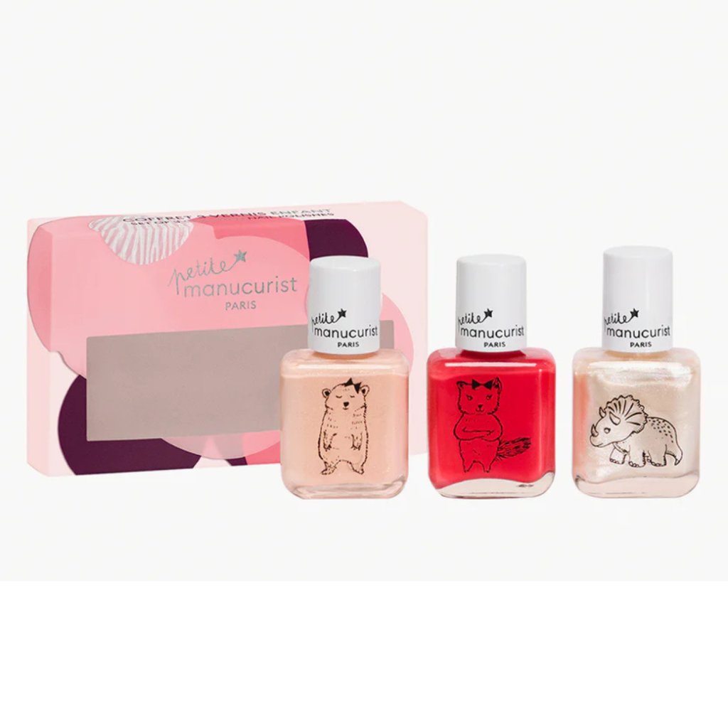 Sváteční dárková sada tří laků na nehty určených speciálně pro děti. Jejich hravé odstíny s jemným perleťovým nebo třpytivým efektem dělají z lakování zábavný rituál, který děti milují. Laky mají vodní bázi, neobsahují žádné toxické látky a jejich složení je až z 95 % přírodního původu. Nanášejí se jednoduše a odstraňují pouhým umytím rukou mýdlem a vodou. Perfektní jako zábava o víkendu nebo doplněk na dětskou oslavu.