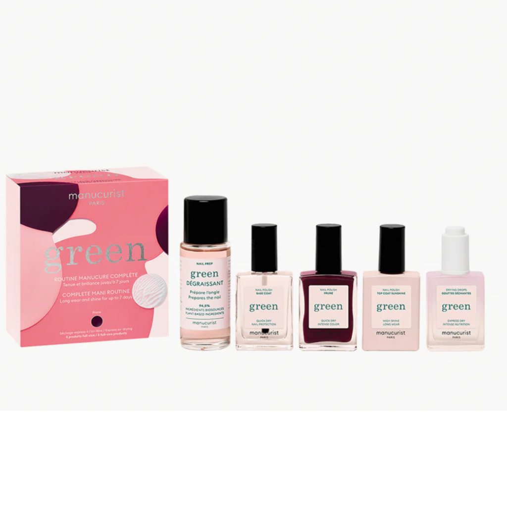 Sada obsahuje 5 produktů v plné velikosti – pro přípravu nehtu pomocí odmašťovače, podkladovou vrstvu, sytou barvu Prune, vrchní lak se zářivým leskem a expresní kapky pro rychlé zakončení manikúry.
