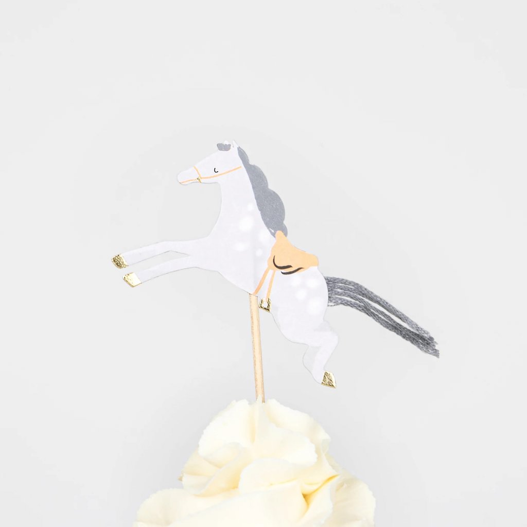 Staňte se mistrem ve výrobě cupcaků s touto úžasnou sadou. Vyznačuje se chytře navrženými koňskými toppery s úžasnými ocasy se střapci a pruhovanými pouzdry na košíčky. Ideální pro vytváření chutných pochoutek na párty pro milovníky koníků.