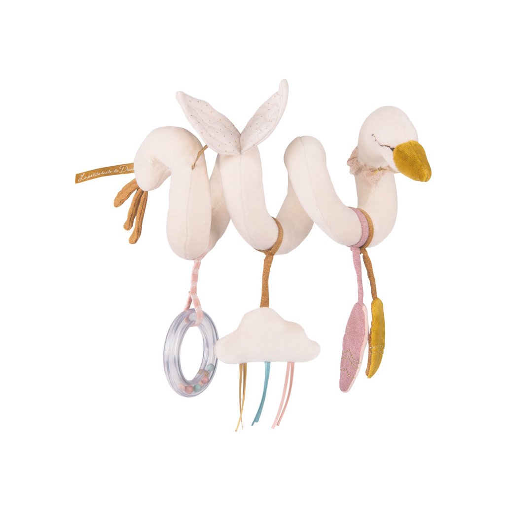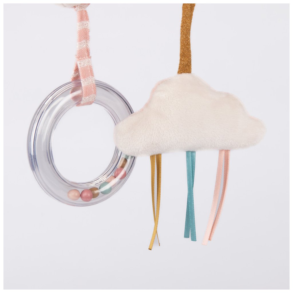 Pískací hračka v obláčku, šustící papír v křídlech, poutka na zatažení, kroužkové chrastítko s korálky... Snadno se omotá kolem ohrádky, kočárku nebo držadla v autě. Lze prát v pračce na 30°C na cyklus vlna. Nesušit v sušičce.