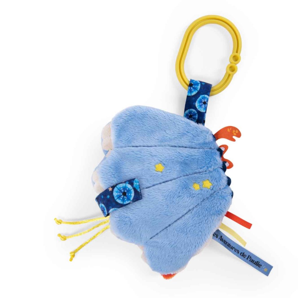 Uvnitř se ukrývá zrcátko, šusticí papír, pískátko, stužky a štítky k prozkoumávání – vše, co malé ručičky i ouška nadchne. Mušličku lze snadno připevnit kamkoliv a její suchý zip při otevírání vydává zvuk, který děti milují.
