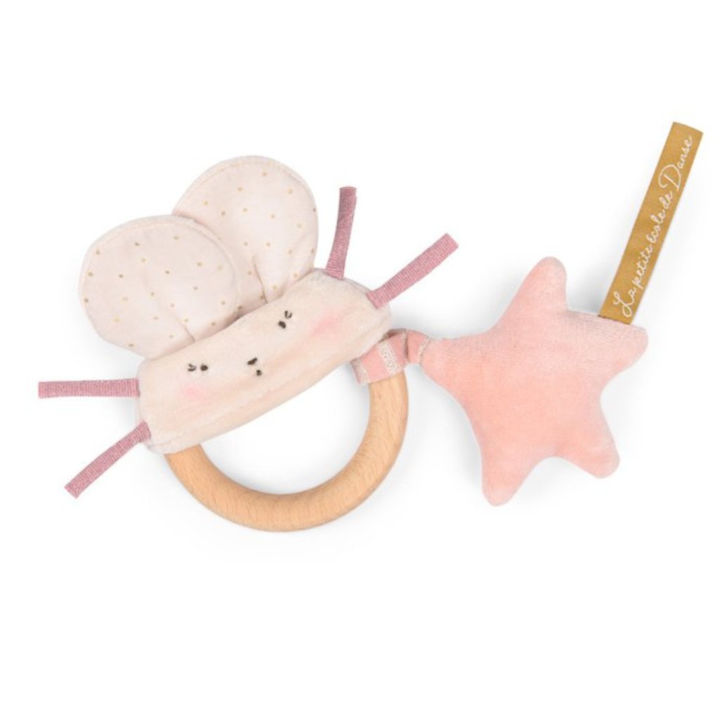 MOULIN ROTY Chrastítko s dřevěným kroužkem Pink mouse