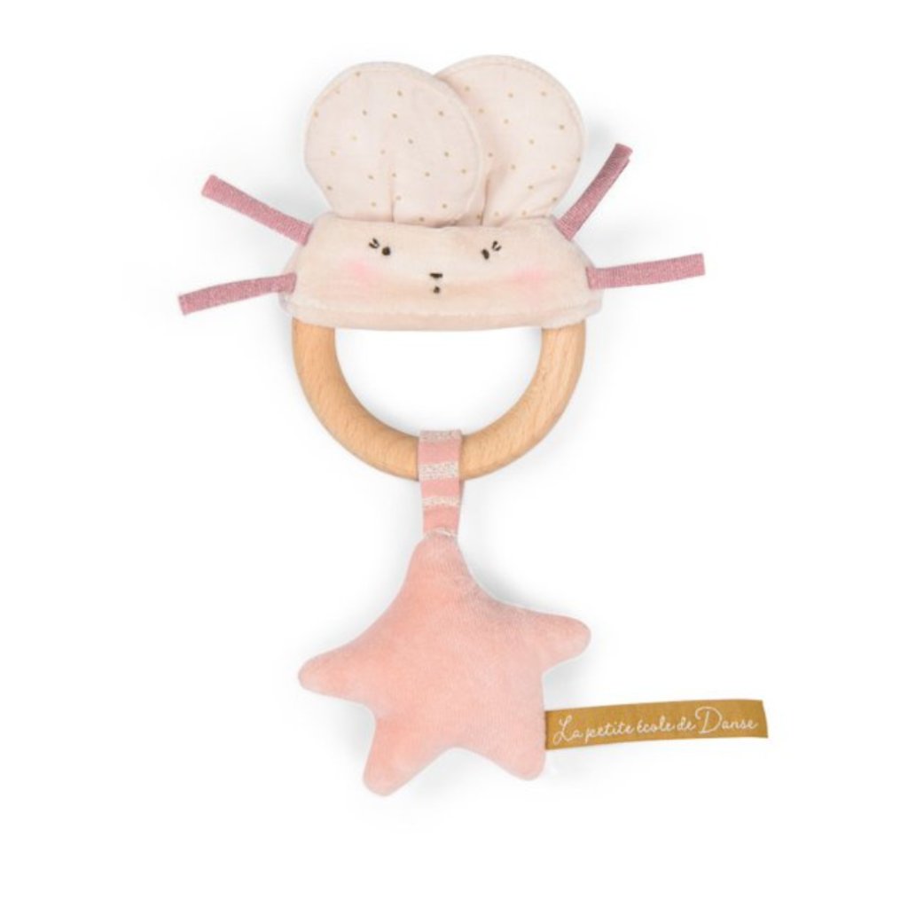 Růžová myška na dřevěném kroužku, doprovázená svou hvězdou, která vydává pěkný zvuk zvonku. Myška má také šustící ouška, fousky ze stužky.