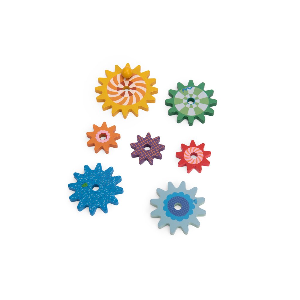 Dřevěná deska, na kterou děti vyskládají různě barevná a velká kolečka, a vytvoří tak otáčecí mechanismus.