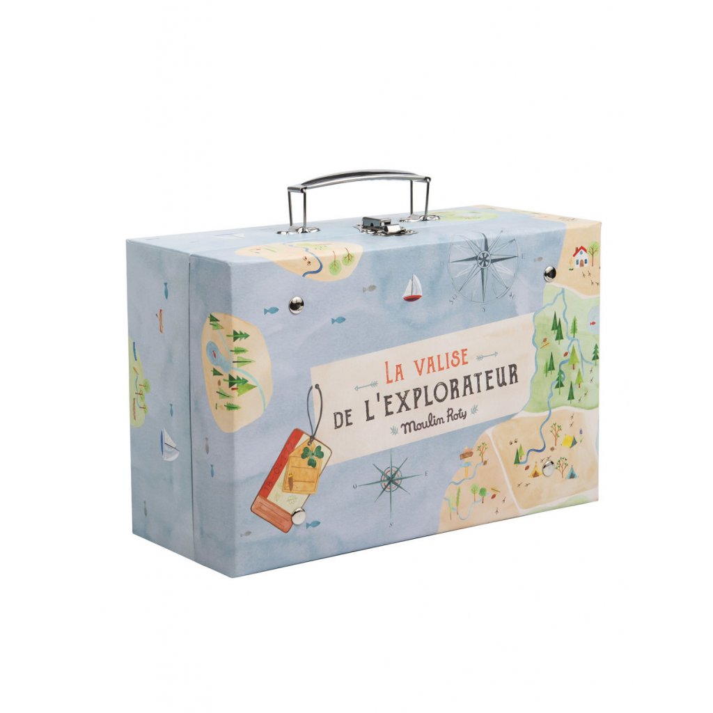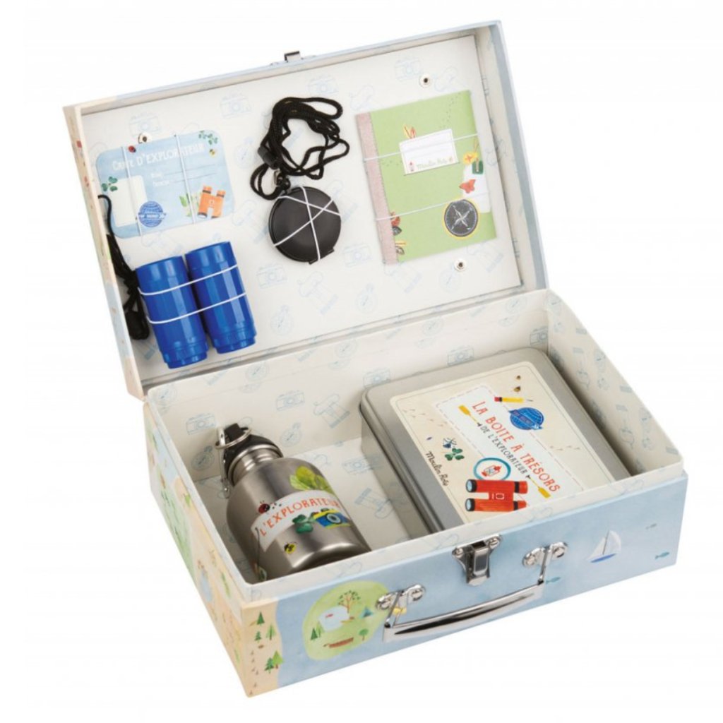 Krásný praktický kufřík pro malého cestovatele nebo cestovatelku. Obsahuje kompas, dalekohled, cestovatelský zápisník, termosku na něco osvěžujícího, jmenovku a plechovou krabičku na nalezené poklady. Vše uschované v malovaném kufříku krásně padnoucím do ruky.