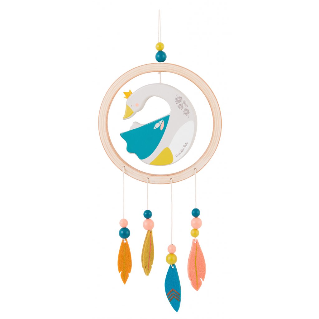 Lapač snů s motivem husy Olgy od Moulin Roty je jemná dekorace do dětského pokoje, která navodí klidnou atmosféru před spaním. Zavěšené peříčka a korálky se při pohybu lehce houpou a vytvářejí uklidňující efekt. Stylové pastelové barvy a dřevěné provedení krásně zapadnou do každého interiéru.