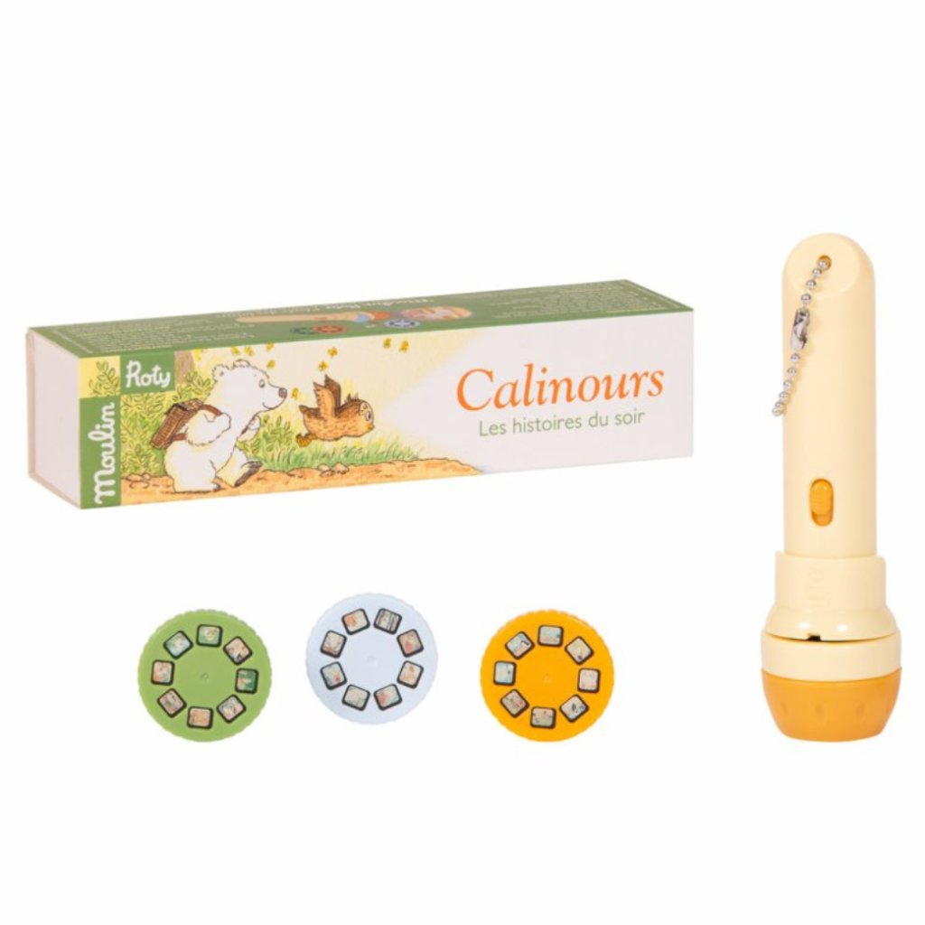 Jednoduše vložte jeden z disků na konec této baterky a promítejte na zeď nebo strop kouzelné ilustrace z dílny Moulin Roty. Obrázky se mění otáčením hlavy promítačky, pro zaostření použijte přední část baterky, pootočením zaostříte obraz. Baterka se třemi disky obsahuje 24 různých krásných obrázků.