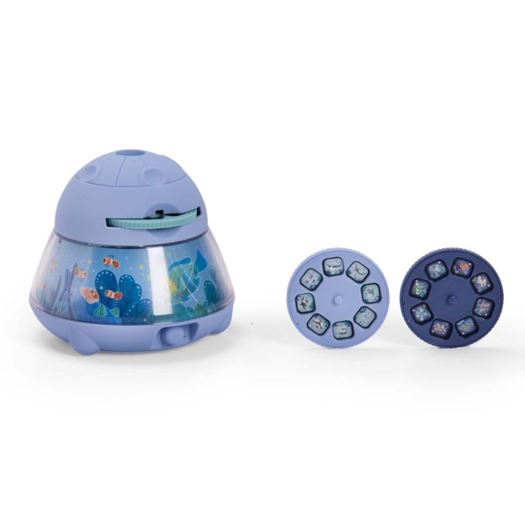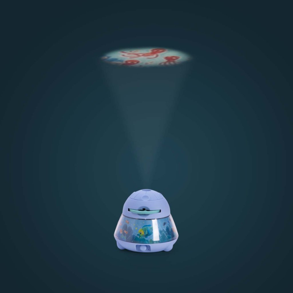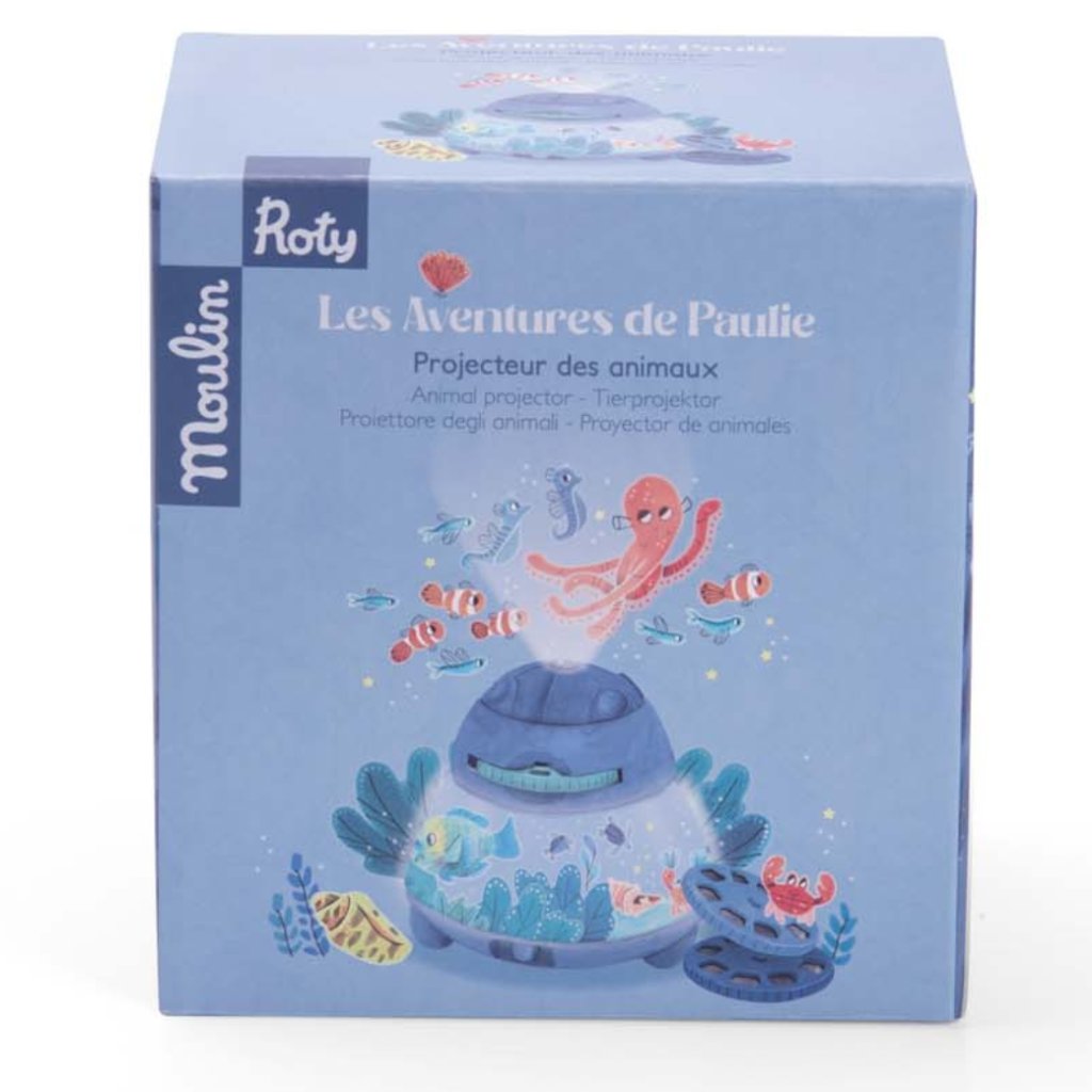 Projektor zvířátek z kolekce Les aventures de Paulie od značky Moulin Roty promění večer v kouzelné objevování oceánu. Děti si pomocí tří disků s celkem 24 ilustracemi promítají mořská zvířata a vytvářejí vlastní příběhy. Součástí je i jemná noční lampička, která osvítí krásný podmořský motiv a po 15 minutách se automaticky vypne – ideální pro klidné usínání.