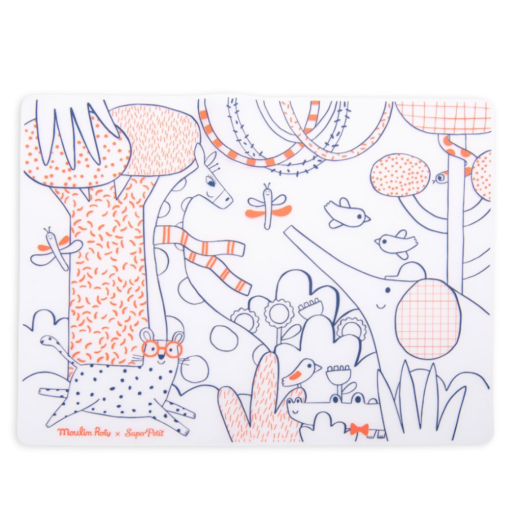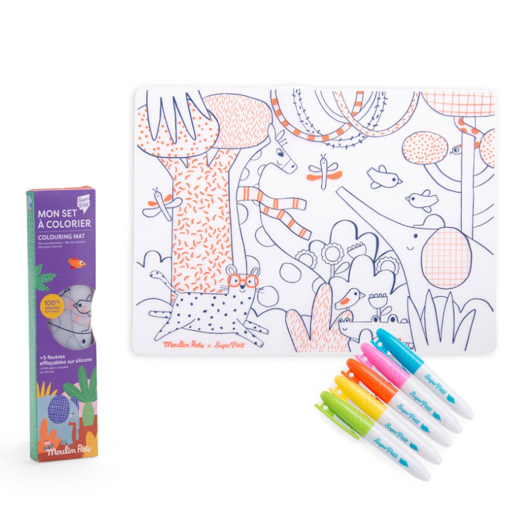 Tento silikonový omyvatelný set z kolekce Les Toupitis vznikl ve spolupráci se Super Petit a promění každé jídlo v zábavnou kreativní chvilku. Děti mohou podložku vybarvovat stále dokola – stačí použít přiložené mazatelné fixy a poté vše jednoduše setřít.