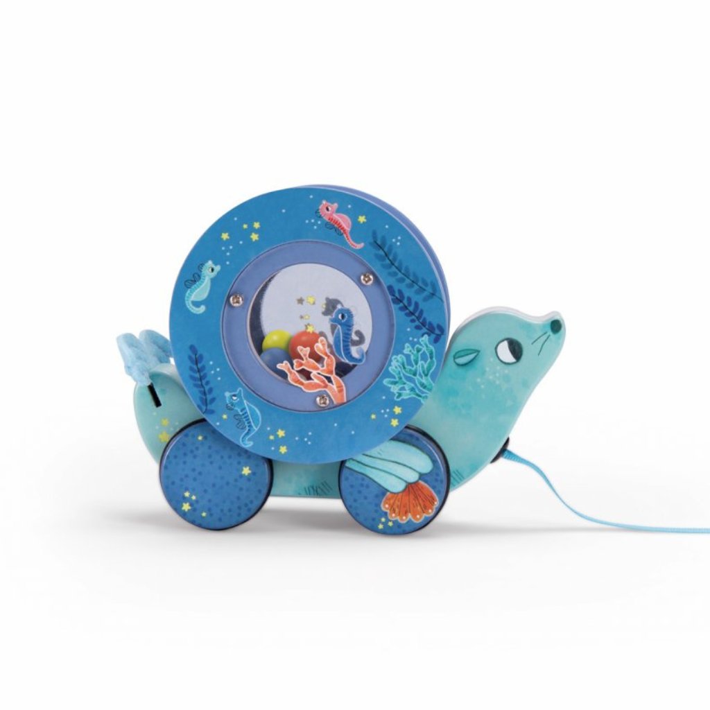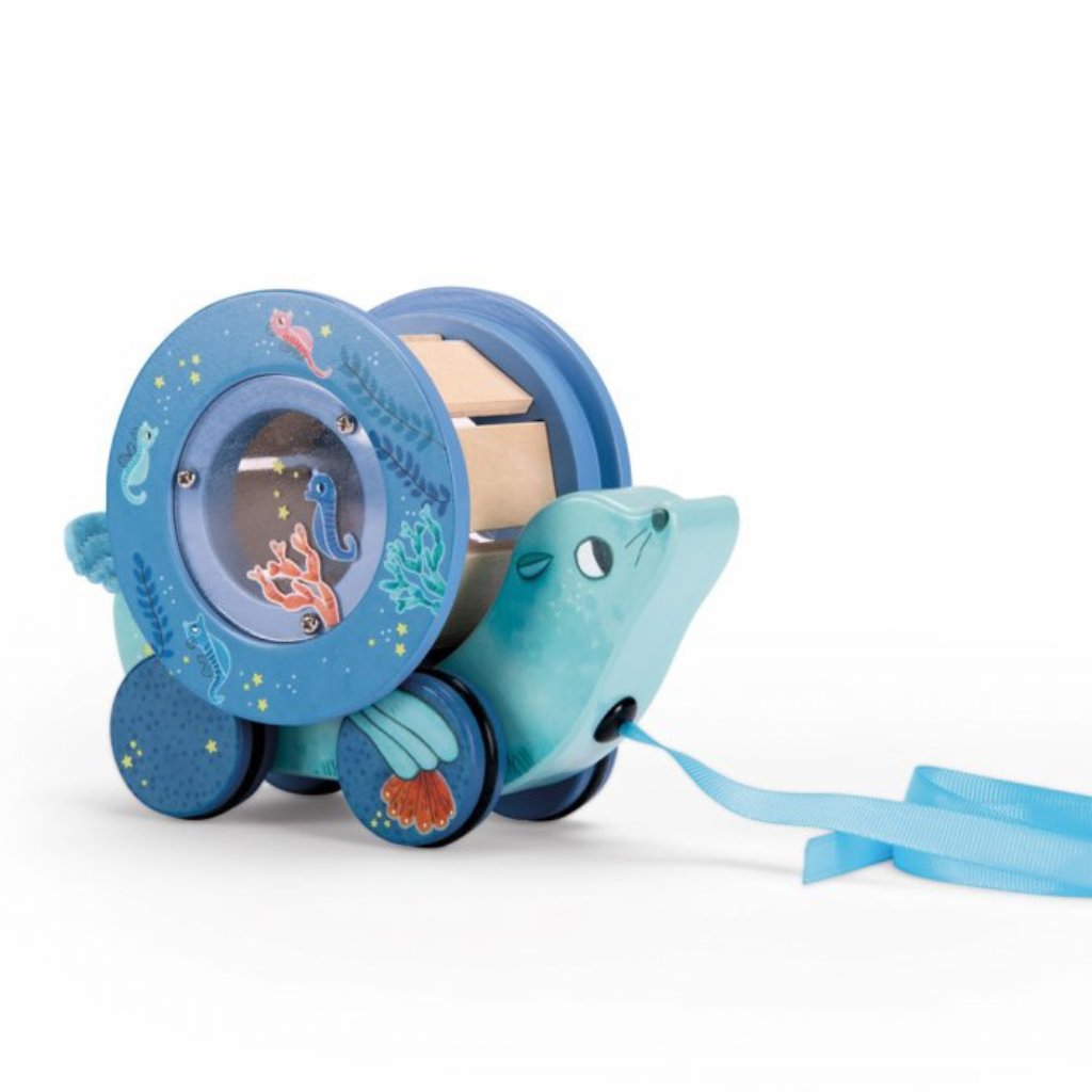Tahací tuleň ze dřeva, který bude skvělým společníkem při objevování světa zvuků a doteků. Hravá Émilie veze na zádech legrační krabičku s barevnými korálky. Stačí zatáhnout za stužku a korálky se začnou pohybovat a chrastit – ideální pro stimulaci sluchu a jemné motoriky.