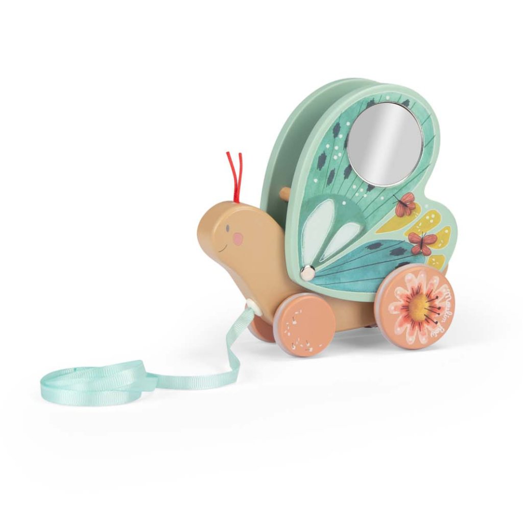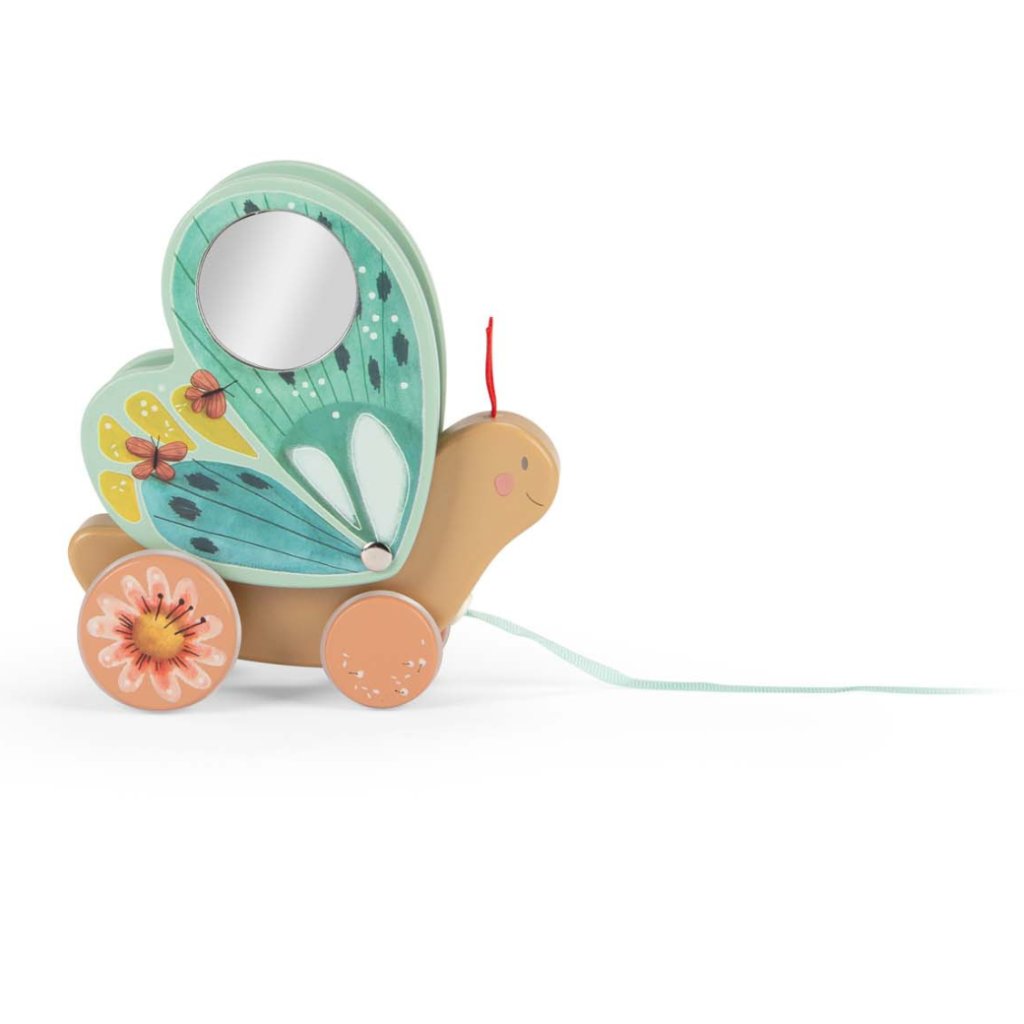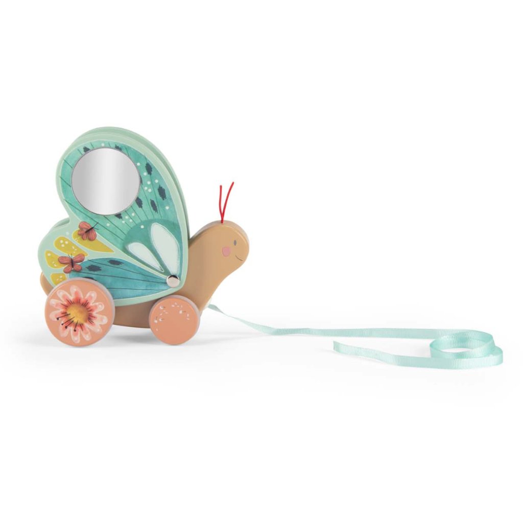 Při pohybu mu mávají křídla a v bříšku cinká rolnička, která dodává hře kouzelný rytmus. Stačí zatáhnout za stužku – a motýlek se vydá na dobrodružnou cestu.