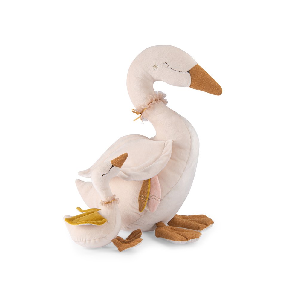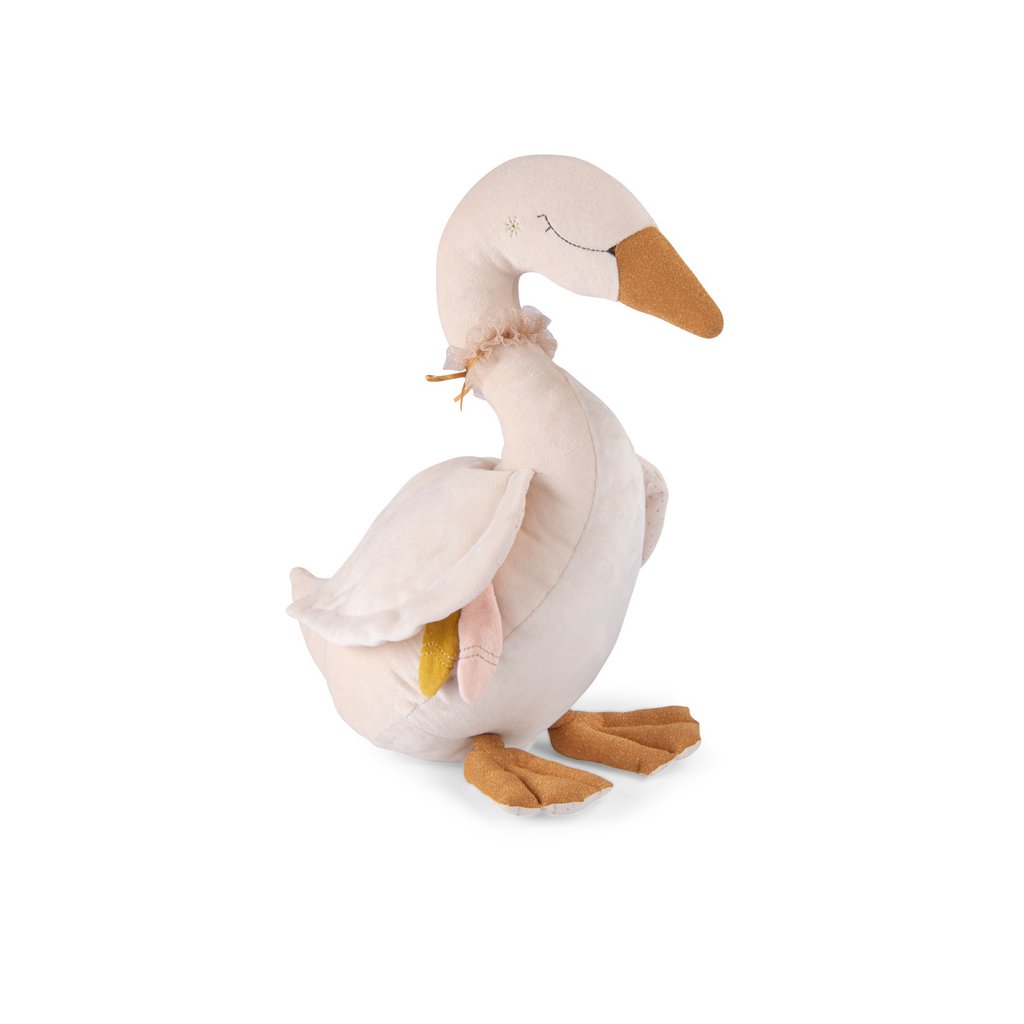 Se svým tylovým náhrdelníkem, zlatým zobáčkem a vyšívanými detaily vypadá prostě královsky. Skrývá korálky, pískací hračku a šustící papír pro stimulaci miminka.