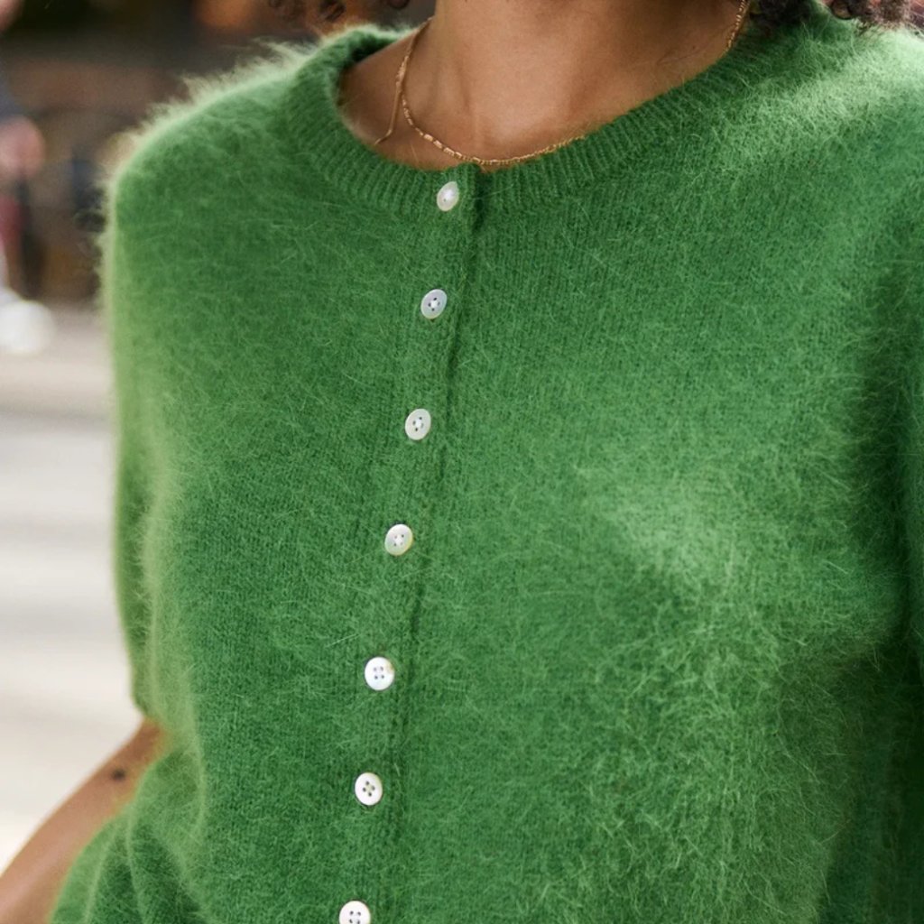 Hebký kardigan s jemným leskem perleťových knoflíků, ideální pro elegantní vrstvení.