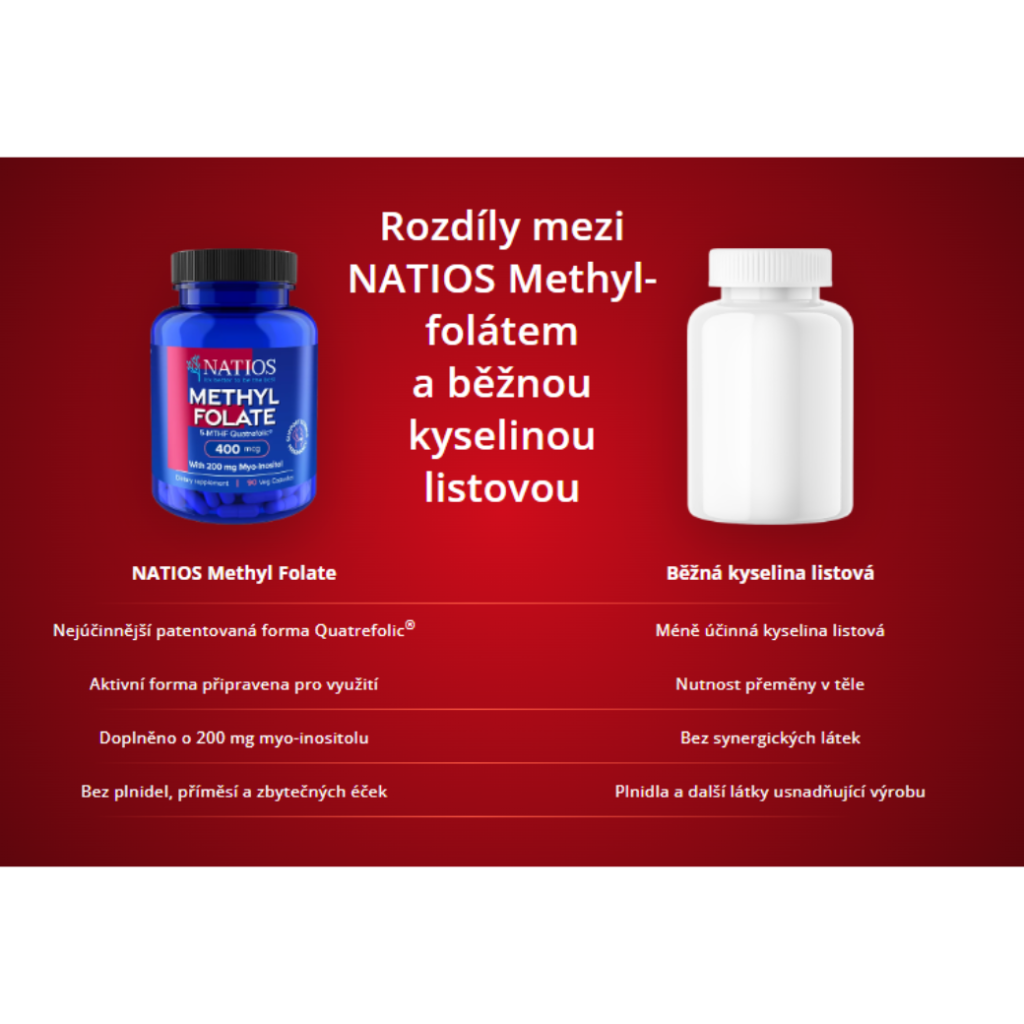 NATIOS Methyl Folate Quatrefolic® přináší aktivní formu folátu (5-MTHF), kterou tělo dokáže okamžitě využít bez nutnosti přeměny. V kombinaci s myo-inositolem poskytuje komplexní podporu krvetvorby, buněčného dělení i ženského zdraví – ideální volba nejen pro období plánování a těhotenství.