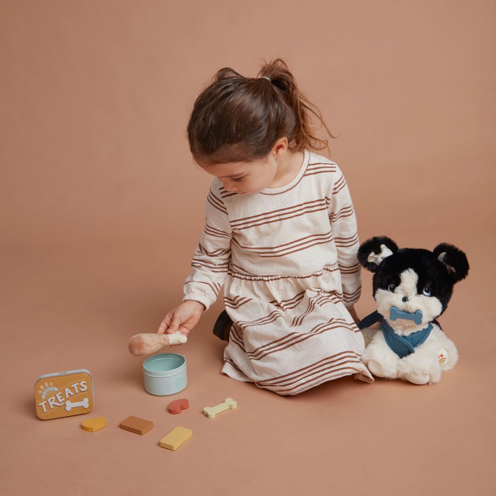 Set obsahuje 6 dřevěných magnetizovaných pamlsků ve tvaru sušenek, srdíček a kostí, plus 1 plechovku na pamlsky, 1 plechovou misku na jídlo a 1 magnetickou plyšovou kostičku.