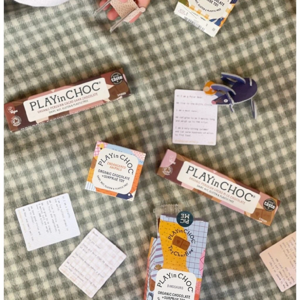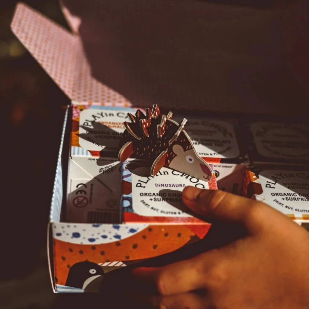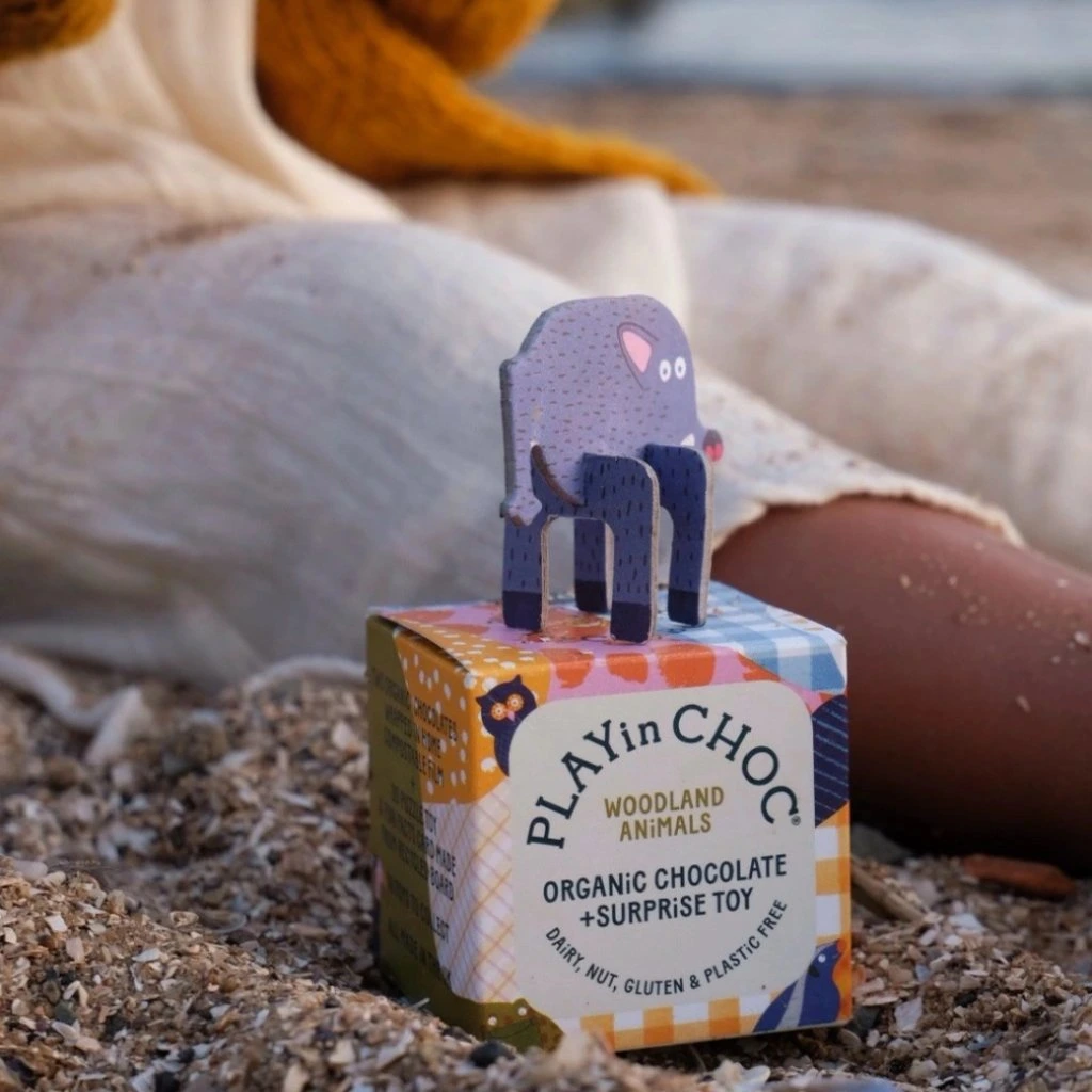 Krabička PLAYin CHOC ToyChoc obsahuje dvě jednotlivě balené 10g porce lahodné, krémové organické čokolády bez mléka, 3D kartonovou skládačku a zábavnou kartičku s fakty. Tato edice přináší 18 různých lesních zvířátek – získáte veverku, lišku, sovu nebo třeba ježka? Každá figurka má vlastní vzdělávací kartičku a šablonu, kterou můžete po sestavení využít.
