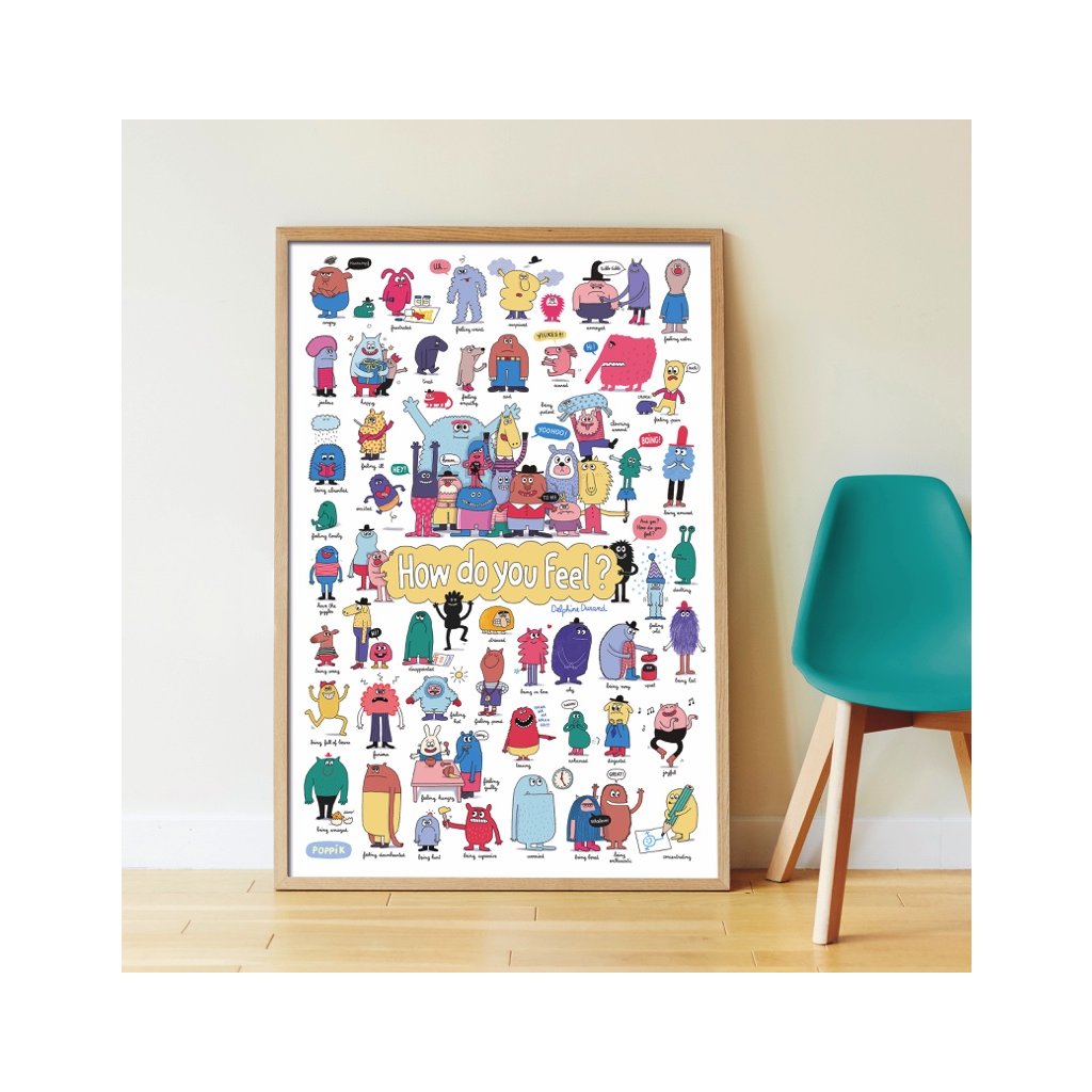 Plakát vytištěný na obou stranách (1 strana ve francouzštině, 1 strana v angličtině). Dítě nalepí na plakát 60 velkých samolepek podle uvedených čísel a objeví tak nové emoce. Originální vzdělávací hra pro učení a zábavu.