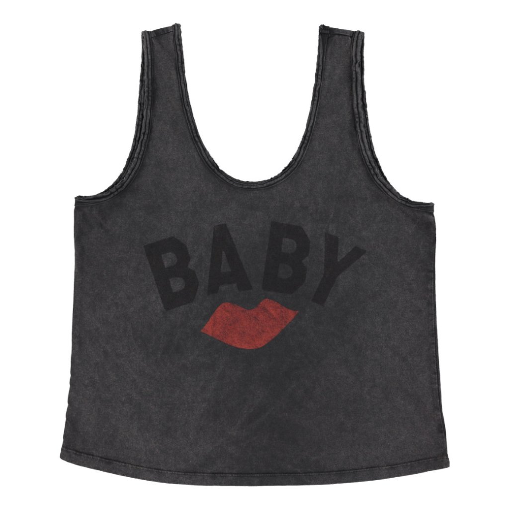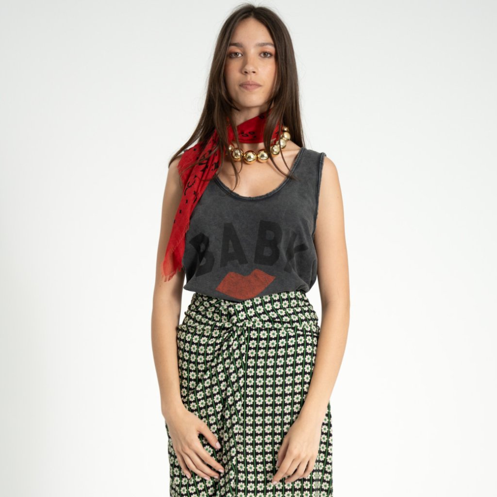 Bezrukávový top s výstřihem do V je vyrobený z bavlny typu flammé a doplněný potiskem na přední straně. Na zadní části nechybí malý logo detail. Lehký materiál a jednoduchý střih z něj dělají ideální kousek na teplejší dny i vrstvení.