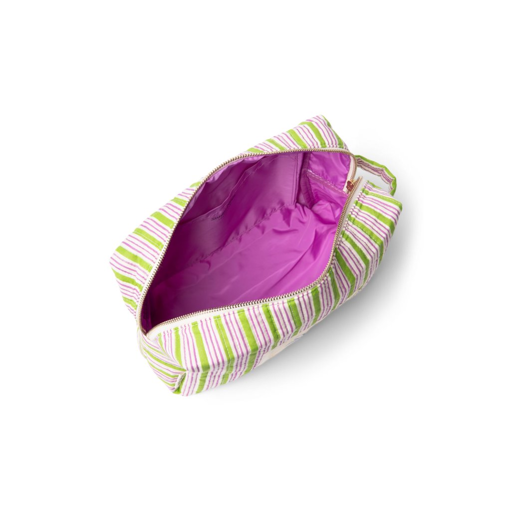 Půvabná kosmetická taštička ve světle zelené, růžové a bílé pruhované variantě s ilustrací mušle a různými přihrádkami.