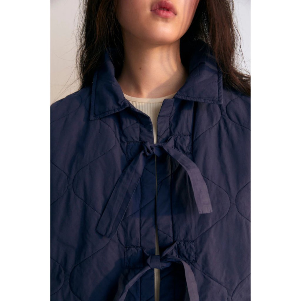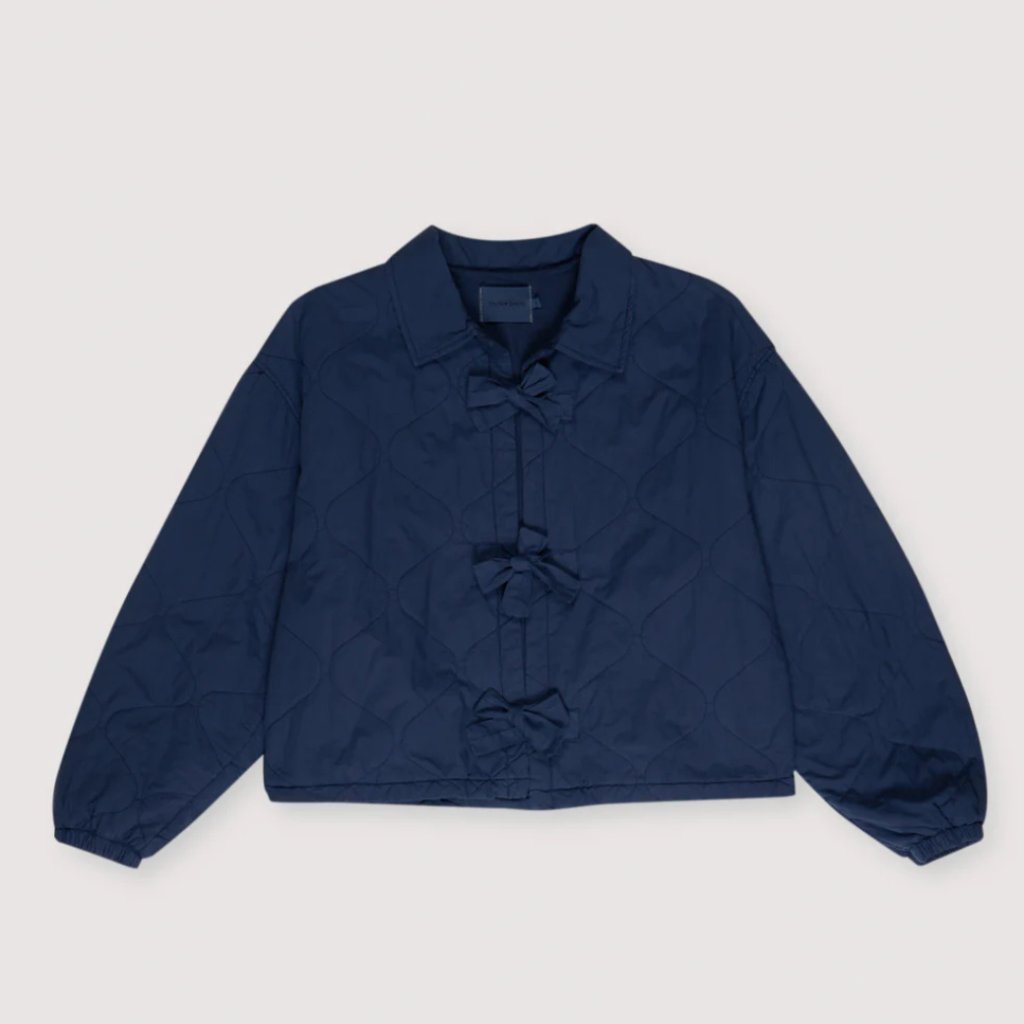 Dámská bunda Panacea je nadčasovým doplňkem vašeho šatníku, vyrobená ze 100% bavlny pro lehký a prodyšný pocit. K dispozici v elegantní námořnické modři. Pyšní se klasickým košilovým límcem a centrálním zavazováním, které vytváří lichotivou siluetu. Prošívané detaily dodávají bundě ležérní, ale i sofistikovaný design.
