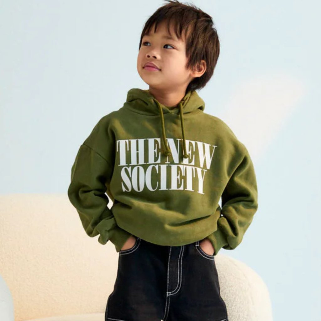 Mikina v odstínu Hidden Forest s výrazným kontrastním potiskem „The New Society“ na přední straně. Jemně broušený materiál z vnější i vnitřní strany poskytne extra pohodlí a hřejivost.