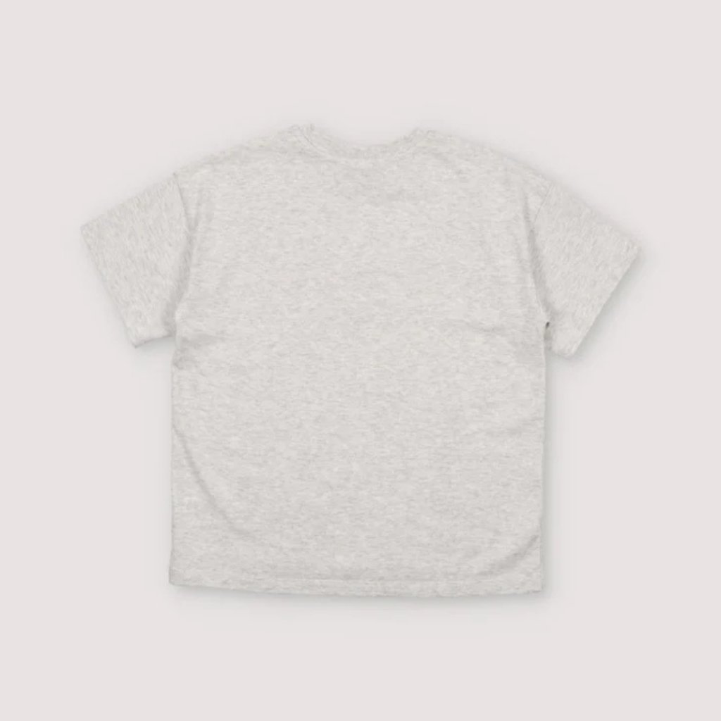 Tričko v šedé melange barvě s žebrovaným límcem a volnými rukávy, navržené pro pohodlný a uvolněný střih.