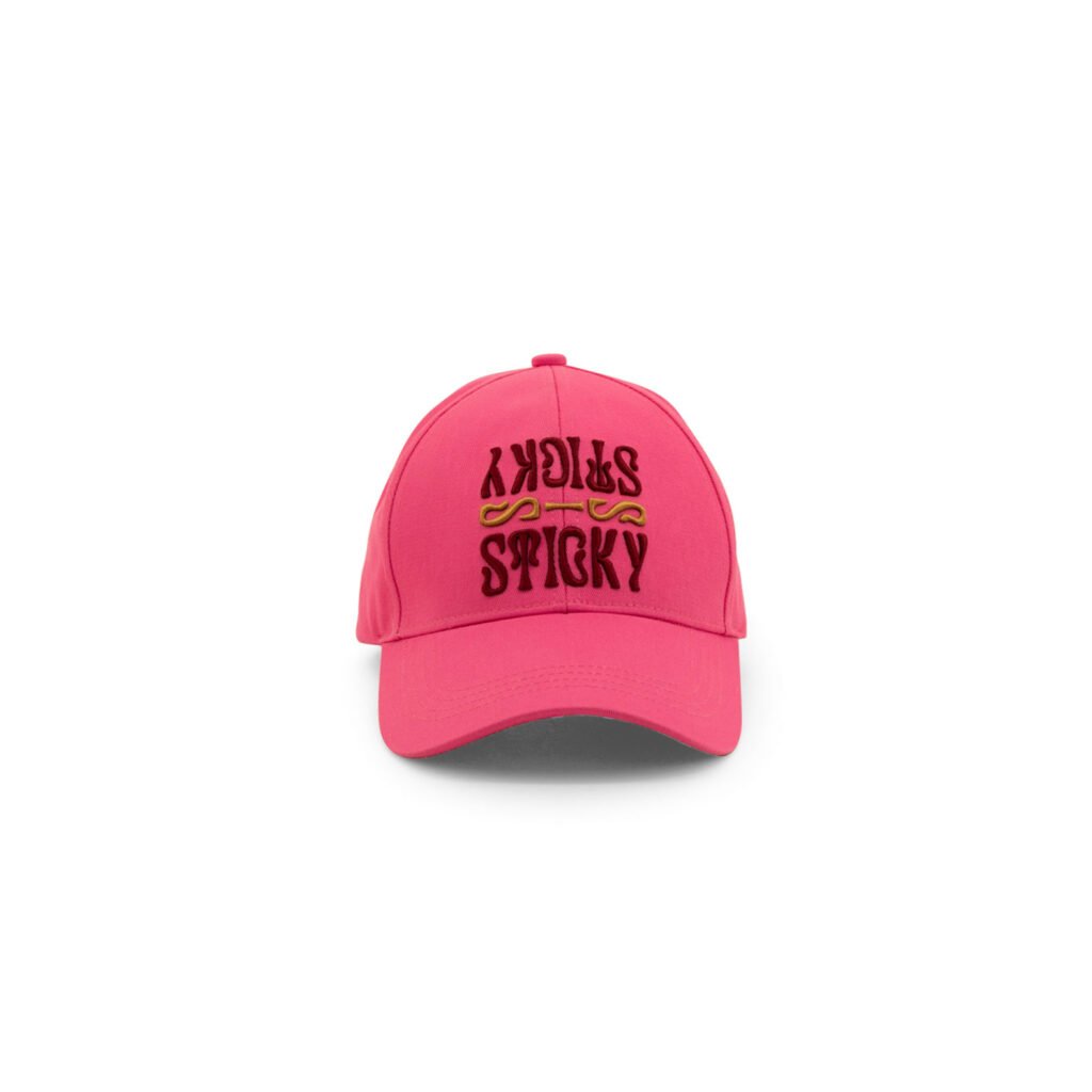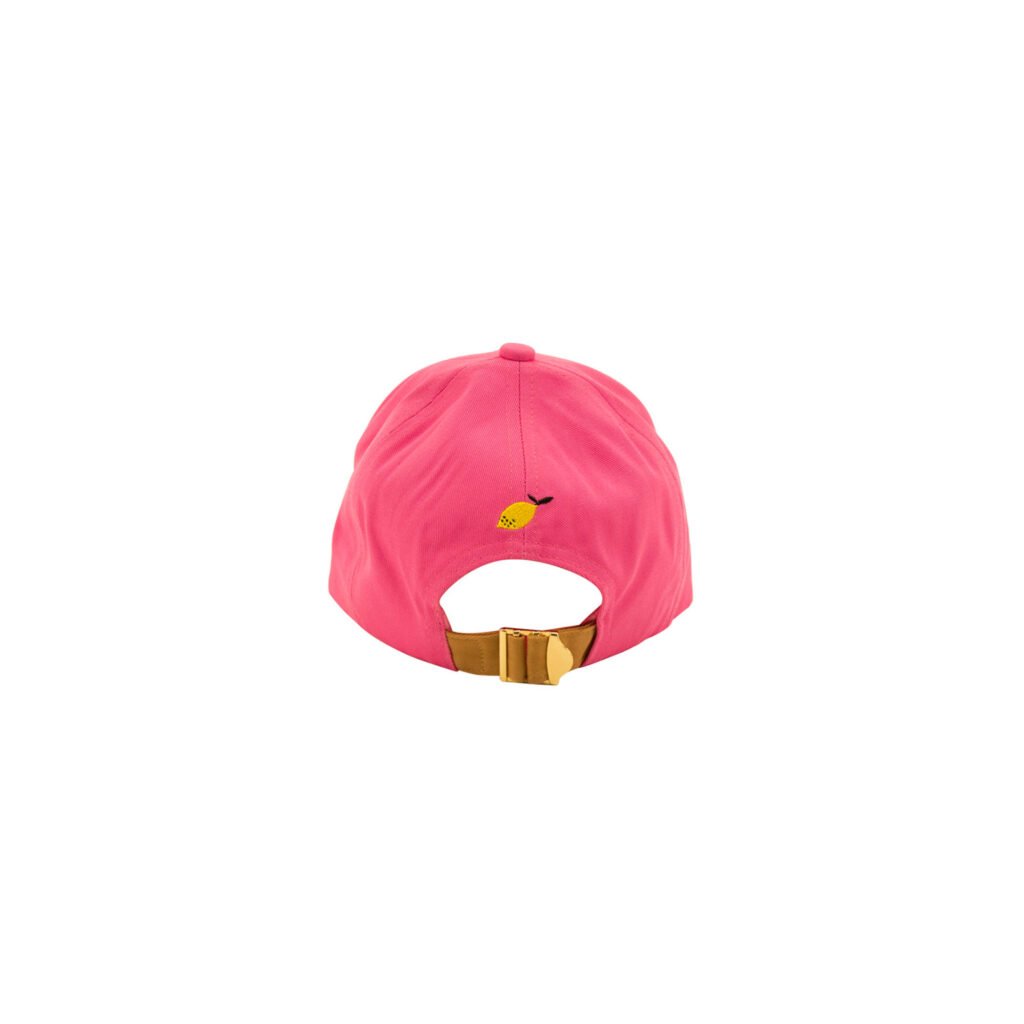 Krásná dámská kšiltovka v sytě růžové barvě. Na zadní straně je nastavitelná zlatá přezka a logo The Sticky sis club ve tvaru citronu.