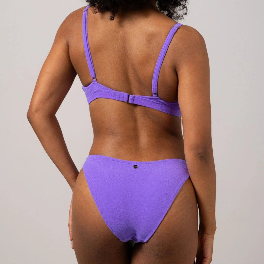 Středně vysoké bikini kalhotky s vykrojeným pasem krásně zvýrazní siluetu. Texturovaný materiál s jemným „terry“ efektem je měkký, pružný a příjemný na nošení – ideální na slunění i koupání.