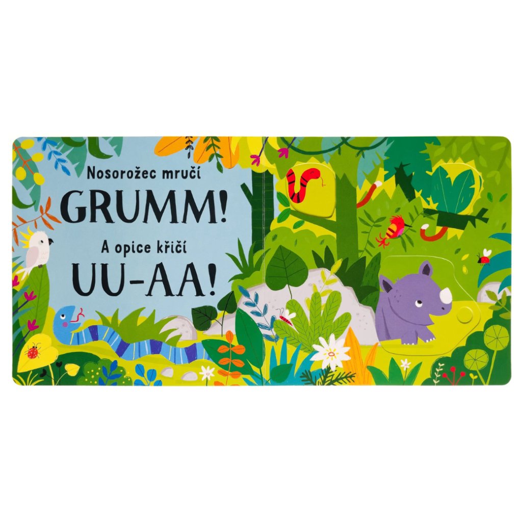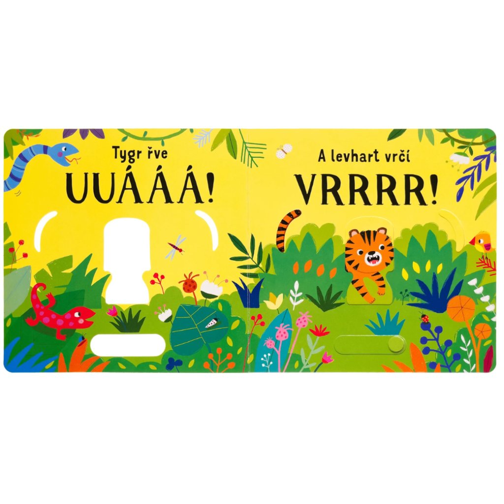 Tahle zvuková knížka s posuvnými prvky zve děti do světa divokých zvířat. Stačí posunout obrázek a ozve se zvuk tygra, levharta, nosorožce, opice a dalších obyvatel divočiny. Děti se učí zvířata poznávat podle zvuku, pozorovat je na obrázcích a zároveň si procvičují jemnou motoriku. Každé otočení stránky je malým dobrodružstvím plným překvapení.