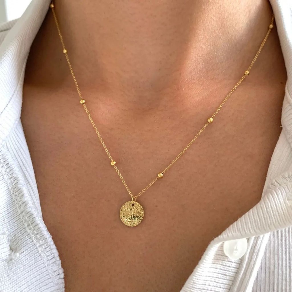 Dámský náhrdelník z nerezové oceli s jemným kuličkovým řetízkem a malým kulatým přívěskem s jemně tepaným povrchem. Zapínání na karabinku, délku lze upravit pomocí 5cm prodlužovacího řetízku.