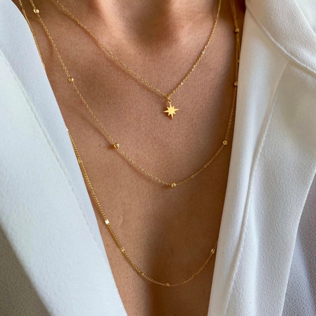 Dámský náhrdelník z nerezové oceli složený ze tří jemných řetízků různých délek, ozdobený přívěskem ve tvaru hvězdy. Minimalistický a šik, ideální i jako dárek!