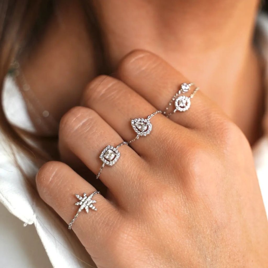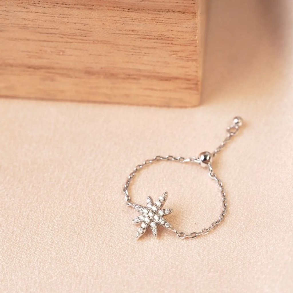 Jemný prsten z pravého stříbra 925, tvořený tenkým řetízkem a drobným třpytivým zirkonem ve tvaru hvězdy. Díky posuvné perličce se velikost snadno přizpůsobí, takže perfektně padne a je ideální i jako dárek.