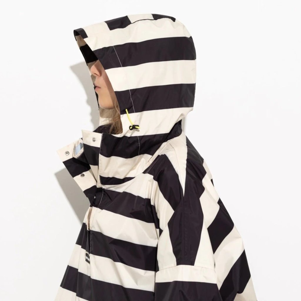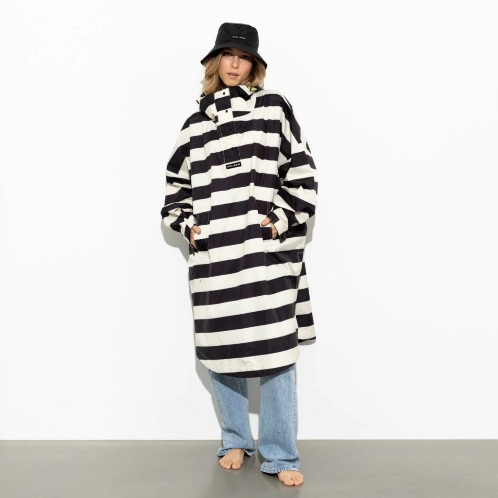 Provedení: kapuce s elastickým páskem, vložka proti dešti s knoflíkovou légou u krku, manžety na suchý zip na rukávech a kapsy na ruce. Díky oversized střihu a zaoblenému lemu je pláštěnka také perfektním společníkem na kole a do cíle dojedete v suchu bez emisí CO2.