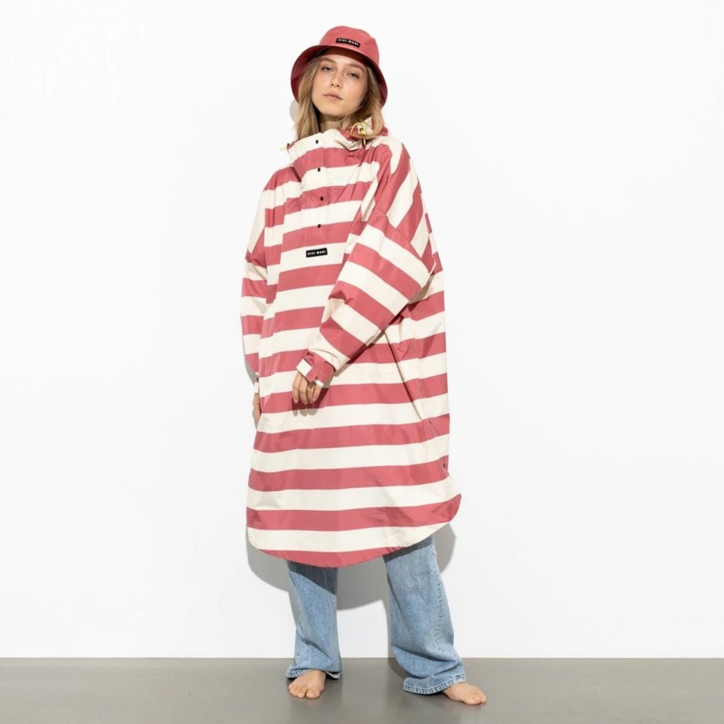 Provedení: kapuce s elastickým páskem, vložka proti dešti s knoflíkovou légou u krku, manžety na suchý zip na rukávech a kapsy na ruce. Díky oversized střihu a zaoblenému lemu je pláštěnka také perfektním společníkem na kole a do cíle dojedete v suchu bez emisí CO2.