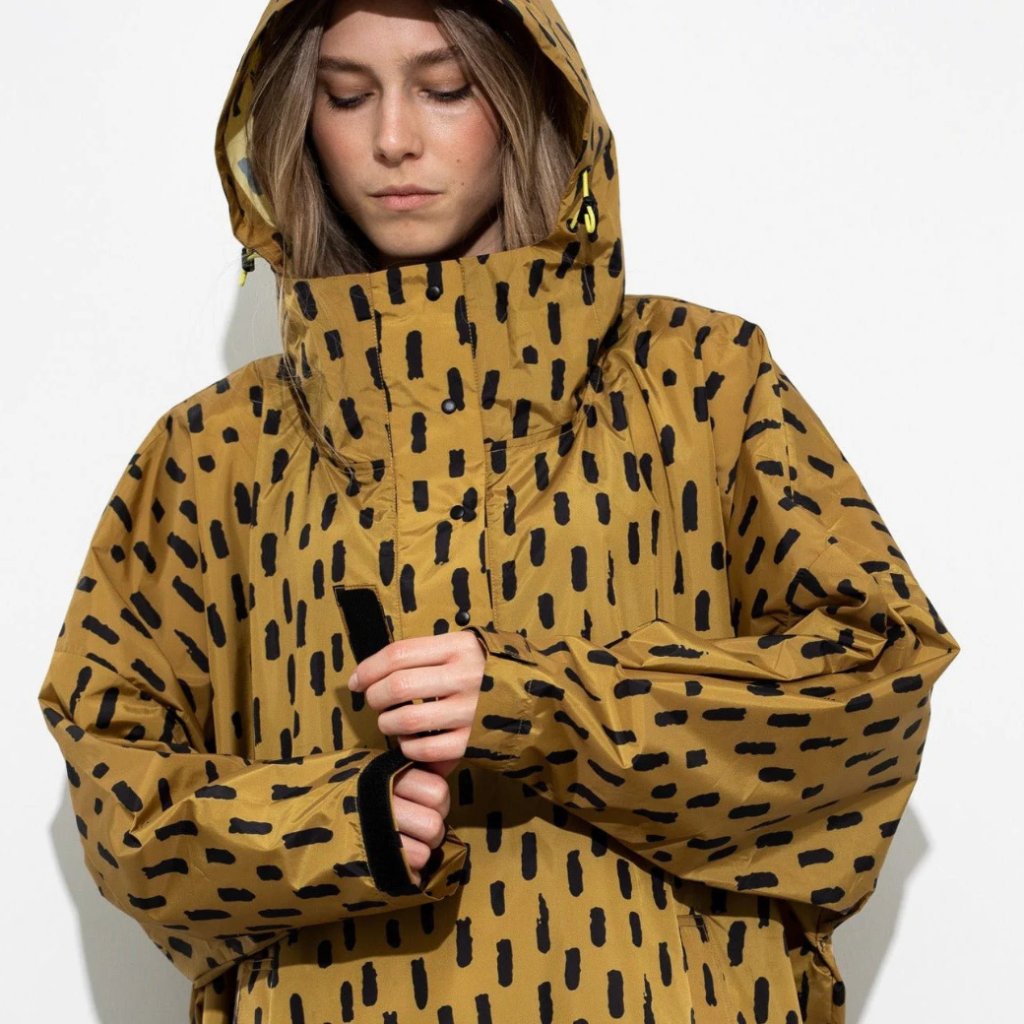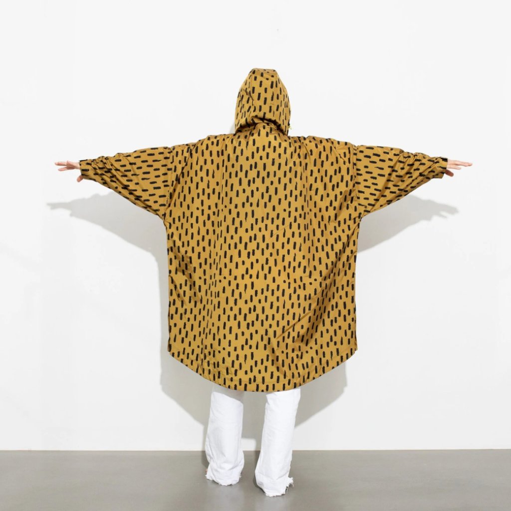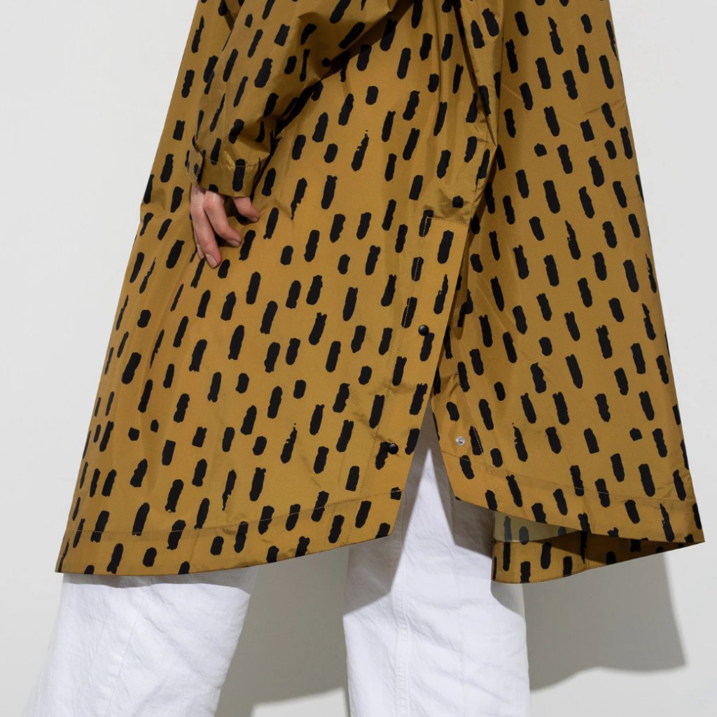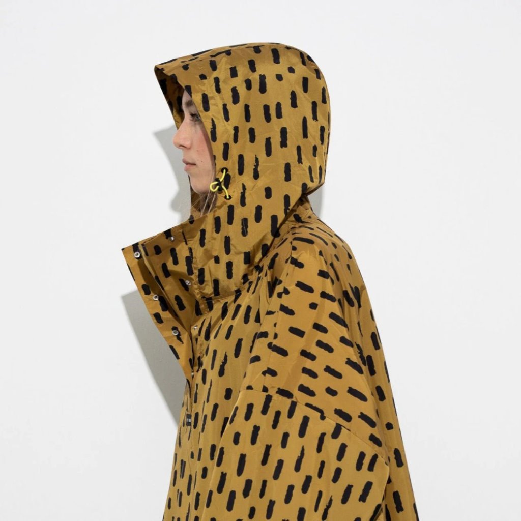 Pláštěnka má design VIVI MARI “drops” v barvě hořčicová/černá a je doplněna praktickými detaily, které vás ochrání před deštěm a větrem: nastavitelná kapuce s pruženkou, krycí légou s knoflíky u krku, nastavitelnými manžetami na suchý zip, kapsami na ruce a prodyšnými otvory. Zaoblený spodní lem s druky zajišťuje volnost pohybu – ideální na cestu na kole bez zbytečných emisí.