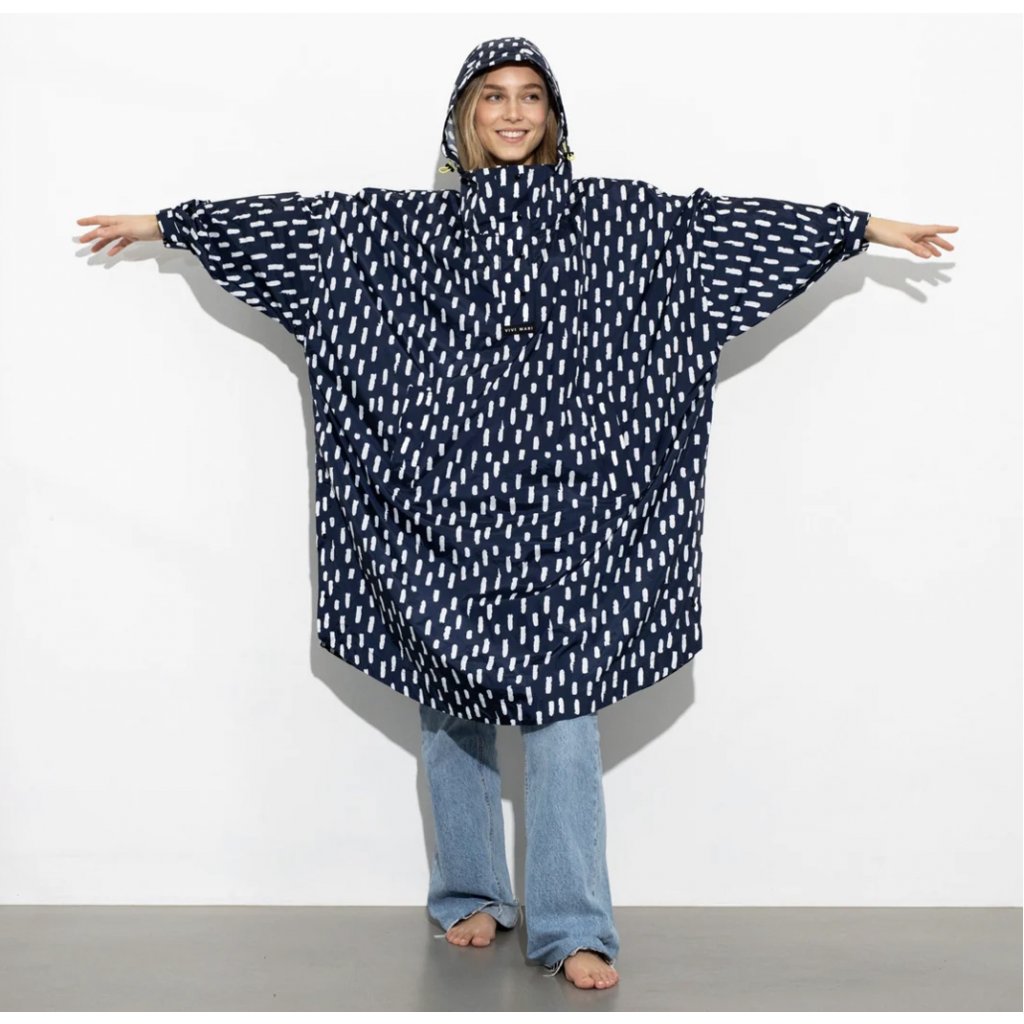 Provedení: kapuce s elastickým páskem, vložka proti dešti s knoflíkovou légou u krku, manžety na suchý zip na rukávech a kapsy na ruce. Díky oversized střihu a zaoblenému lemu je pláštěnka také perfektním společníkem na kole a do cíle dojedete v suchu bez emisí CO2.