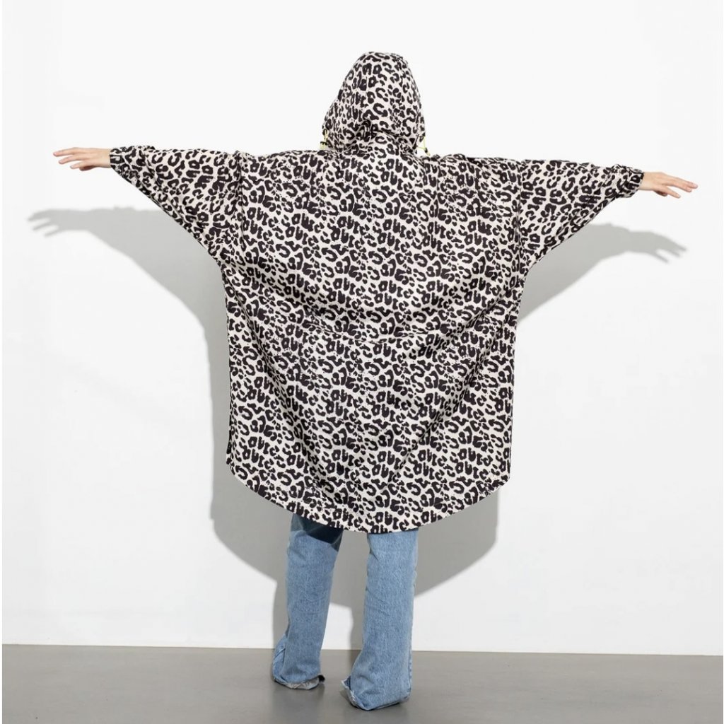 Provedení: kapuce s elastickým páskem, vložka proti dešti s knoflíkovou légou u krku, manžety na suchý zip na rukávech a kapsy na ruce. Díky oversized střihu a zaoblenému lemu je pláštěnka také perfektním společníkem na kole a do cíle dojedete v suchu bez emisí CO2.