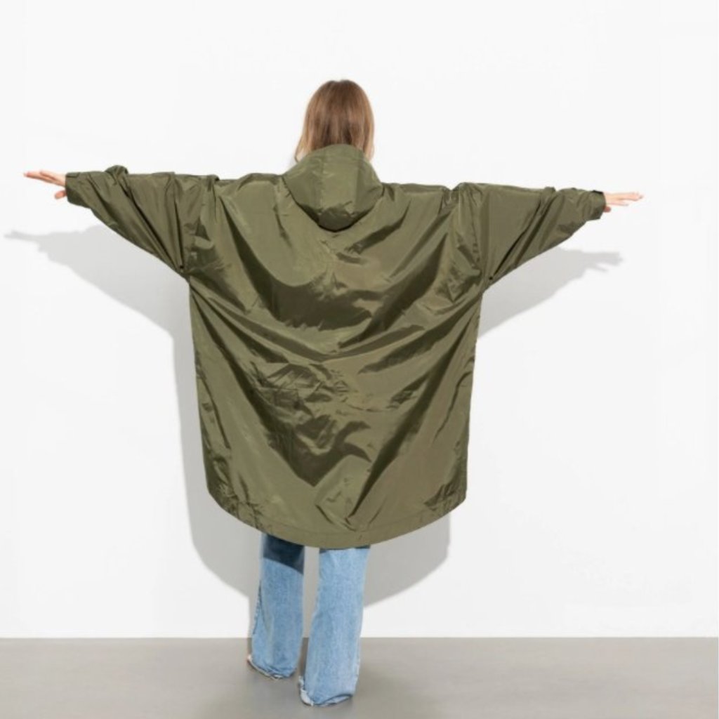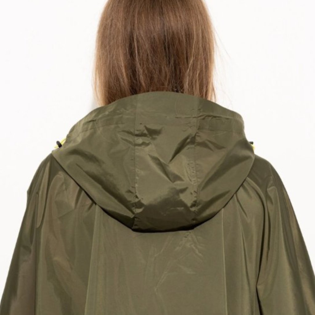 Provedení: kapuce s elastickým páskem, vložka proti dešti s knoflíkovou légou u krku, manžety na suchý zip na rukávech a kapsy na ruce. Díky oversized střihu a zaoblenému lemu je pláštěnka také perfektním společníkem na kole a do cíle dojedete v suchu bez emisí CO2.